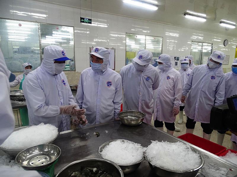 Bộ trưởng Bộ Khoa học và Công nghệ Chu Ngọc Anh (thứ hai từ trái sang) tham quan nhà máy chế biến công ty thủy sản Cases (theo: Báo điện tử Đầu tư)